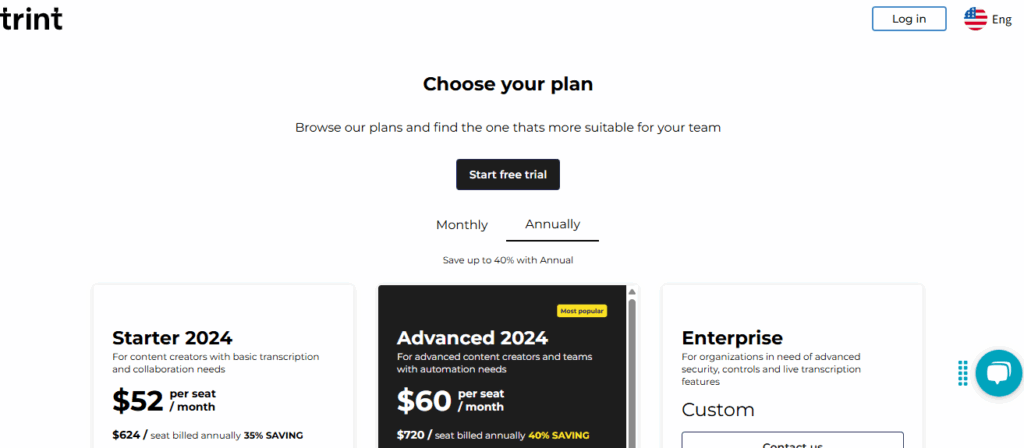 Trint’s pricing model is based on three different plans: Starter, Advanced, and Enterprise. Here’s a quick breakdown of what each plan offers: