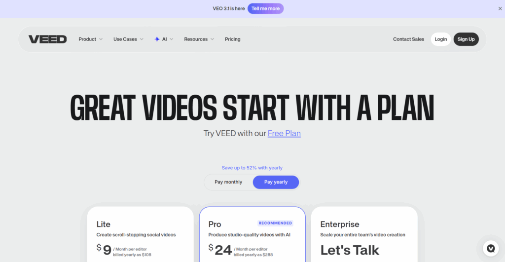 VEED.IO provides advanced video editing capabilities that complement AI-generated content from Veo 3 with precision timeline control, text overlay options, and professional transitions. The platform excels at post-production refinement of AI videos, offering subtitle generation, brand kit integration, and multi-format export options that extend the usability of Artlist-generated content.